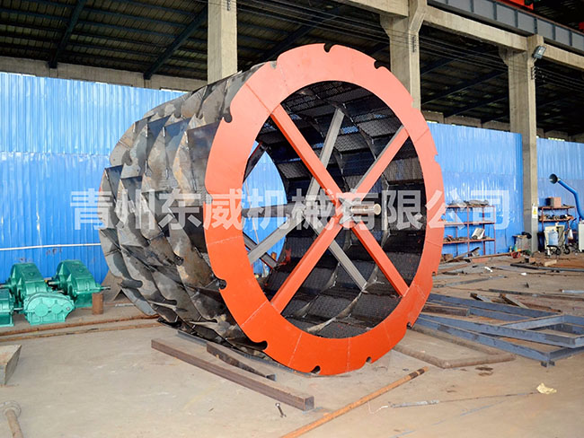 海沙淡化沖洗機(jī)的工作原理如同一臺(tái)滾筒式洗衣機(jī),滾筒內(nèi)設(shè)置螺旋葉片和抓斗,確保進(jìn)料、出料自動(dòng)完成;滾筒旋轉(zhuǎn)攪拌,供水系統(tǒng)連續(xù)不斷注入淡水,對(duì)海砂進(jìn)行反復(fù)沖洗,使含鹽水不斷地從洗沙機(jī)溢水口溢出,完成去鹽工作。